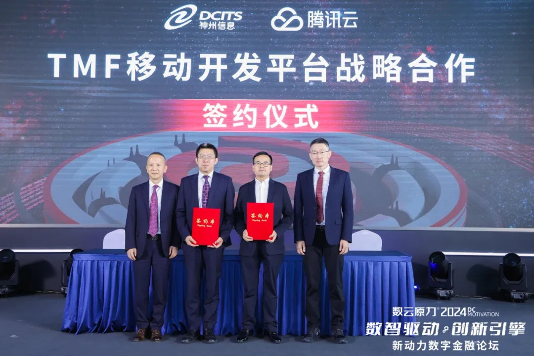 现场还举行了两场签约仪式。在神州信息与腾讯云“TMF 移动开发平台战略合作签约”仪式上,神州信息常务副总裁于宏志、腾讯云副总裁胡利明代表双方签署协议,神州信息总裁李鸿春、腾讯云总裁邱跃鹏共同见证签约。本次签约后,神州信息成为腾讯云TMF金融领域独家授权伙伴,可借助TMF平台功能进行定制化开发,满足客户需求,弥补移动开发短板。